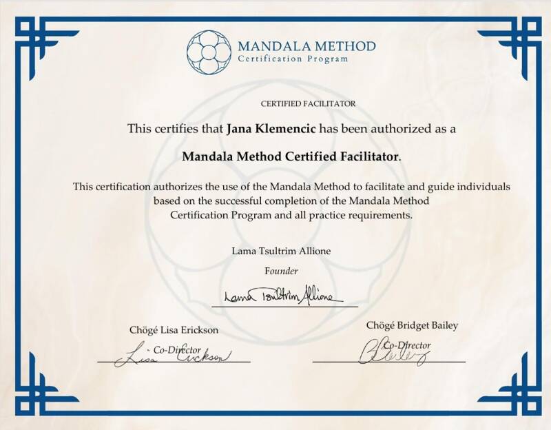Kot dosedaj vsako delo s pomočjo Janinih terapij, je tudi odkrivanje mandale 5ih budinih družin zame predstavljalo prostor podpore, sprejemanja in miline. Ima neverjetno prisotnost, stabilnost in ljubeznivost, ob katerih si upam pogledati širše in globlje, predvsem tja, kamor sama še ne zmorem ali pa potrebujem ljubečo prisotnost, da se mi stvari razkrijejo, točno take kot so. Neizmerno sem hvaležna za prilagodljivost in pripravljenost, da me podpreš tam, kjer sem tisti trenutek ter me povabiš, da se odprem na dobrobit zase in za druge.